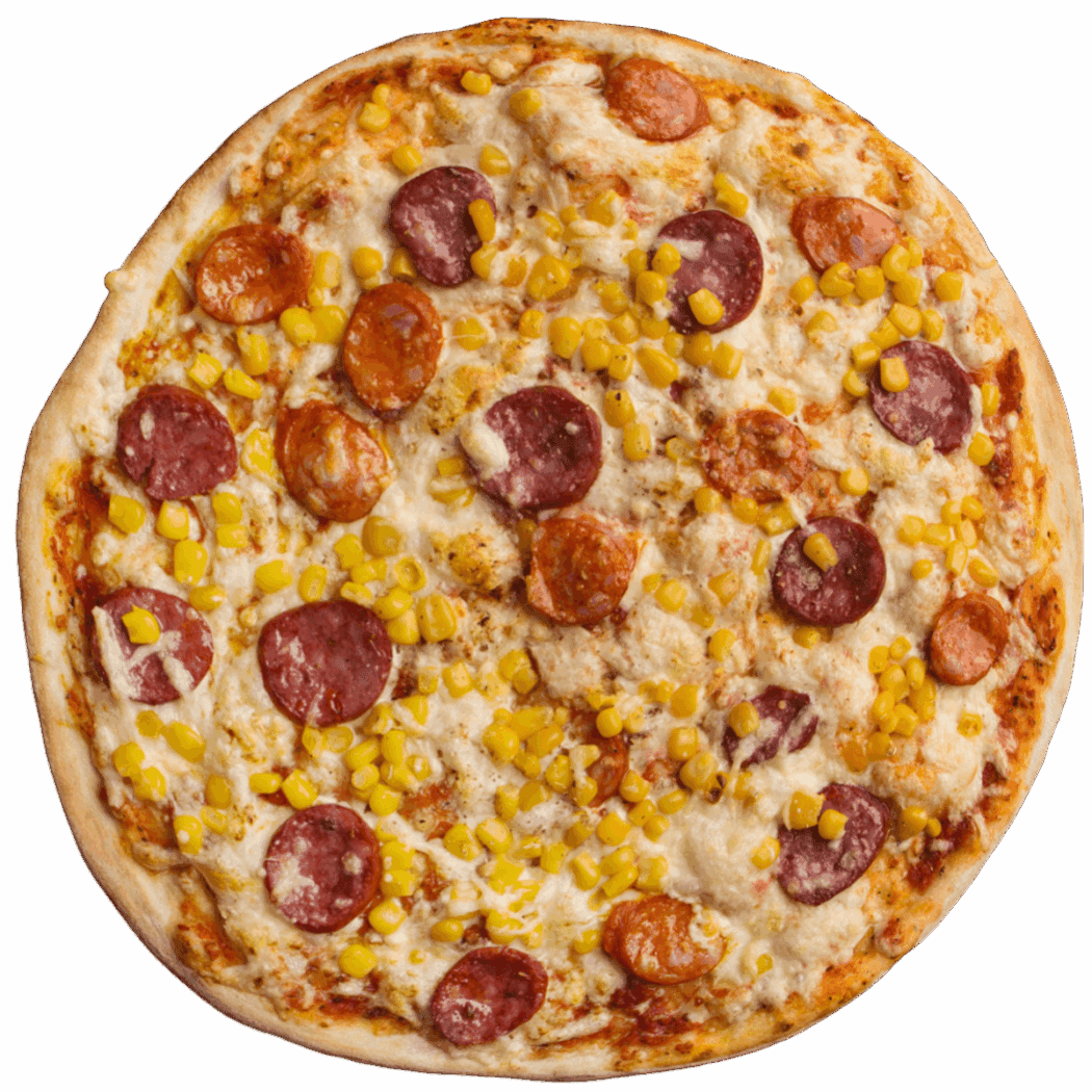Složení: Korpus (mouka pšeničná, olej, kvasnice, sůl, voda, wiener note), tomato (drcená rajčata, oregano, bazalka, sůl, olej), sýr, klobása, kukuřice